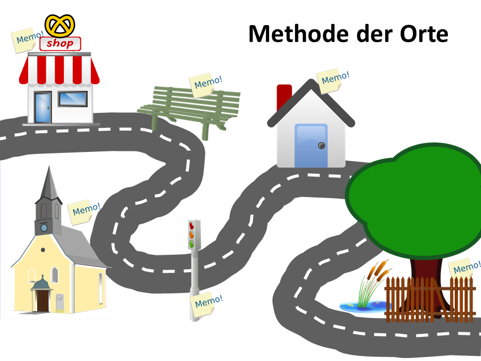 Eine davon ist die Methode der Orte (siehe Abbildung 1). Dabei erlernt man zunächst eine feste Abfolge von Orten, wie beispielsweise die Landmarken auf dem Weg zur Arbeit oder die Räume in einem Palast. Die Merkstrategie besteht nun darin, die Orte nacheinander abzugehen und je einen Ort mit einem zu memorierenden Gedächtnisinhalt zu verknüpfen. Dazu denkt man sich eine besonders außergewöhnliche, humorvolle, gut zu visualisierende und bewegte Geschichte aus, die Ort und Gedächtnisinhalt verbindet. Für den Abruf geht man die Orte nacheinander im Geist ab und decodiert die Geschichte. Hat man erst einmal die Abfolge der Orte erlernt, können sie nun als Anker für alles Mögliche zum Beispiel Telefonnummern, Einkaufs- oder To-do-Listen immer wieder benutzt, quasi neu „beschrieben“ werden. Bei den RednerInnen in der Antike soll diese Technik genutzt worden sein, um den Aufbau ihrer Reden auswendig zu lernen.
