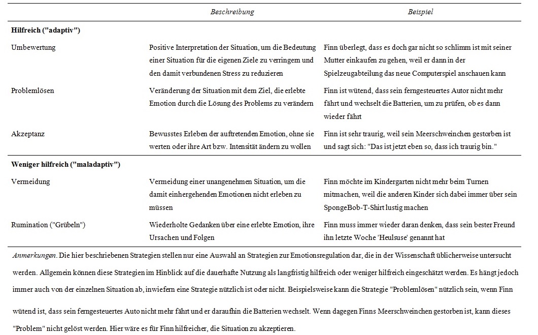 Doch was sind überhaupt angemessene und unangemessene Strategien zur Emotionsregulation und wie wird diese Unterscheidung begründet? Diese Einordnung wird häufig daran festgemacht, inwiefern Personen, die angeben, eine bestimmte Strategie besonders häufig zu nutzen, auch stärkere psychische Probleme berichten und Personen, die diese Strategie seltener nutzen, weniger psychische Probleme berichten. Tabelle 1 gibt eine Übersicht über typische Strategien zur Emotionsregulation und verdeutlicht, inwiefern diese eher als angemessen oder unangemessen angesehen werden können. Diese Einteilung wurde anhand einer Metaanalyse  vorgenommen, in der Aldao, Nolen-Hoeksema und Schweizer (2010) die Ergebnisse von insgesamt 116 Studien zu dieser Frage auswerteten. Die engen Zusammenhänge machen deutlich, dass Emotionsregulation eine wichtige Rolle für die Entwicklung und Aufrechterhaltung von psychischen Störungen spielt. Auch wenn in der Tabelle nur Beispiele für den Umgang mit negativen Emotionen genannt werden, ist auch die Regulation von positiven Emotionen von großer Bedeutung. Hierbei ist es ein weit verbreiteter Trugschluss, dass es per se hilfreich ist, negative Emotionen abzuschwächen und positive Emotionen zu steigern. Beispielsweise kann es unangemessen sein, wenn sich ein Kind extrem freut, dass es im Sport gegen ein anderes Kind gewonnen hat, weil es dieses durch seine Reaktion traurig machen könnte. Eine mangelnde Regulation von positiven Emotionen kann auch dazu führen, dass potentielle Gefahren nicht schnell genug erkannt werden, und steht im Zusammenhang mit verschiedenen psychischen Störungen wie zum Beispiel manischen Episoden, die durch eine intensive, jedoch unbegründet gehobene Stimmung gekennzeichnet sind, welche häufig mit Realitätsverlust und Größenwahn einhergeht und dazu führt, dass betroffene Personen sich völlig verausgaben.