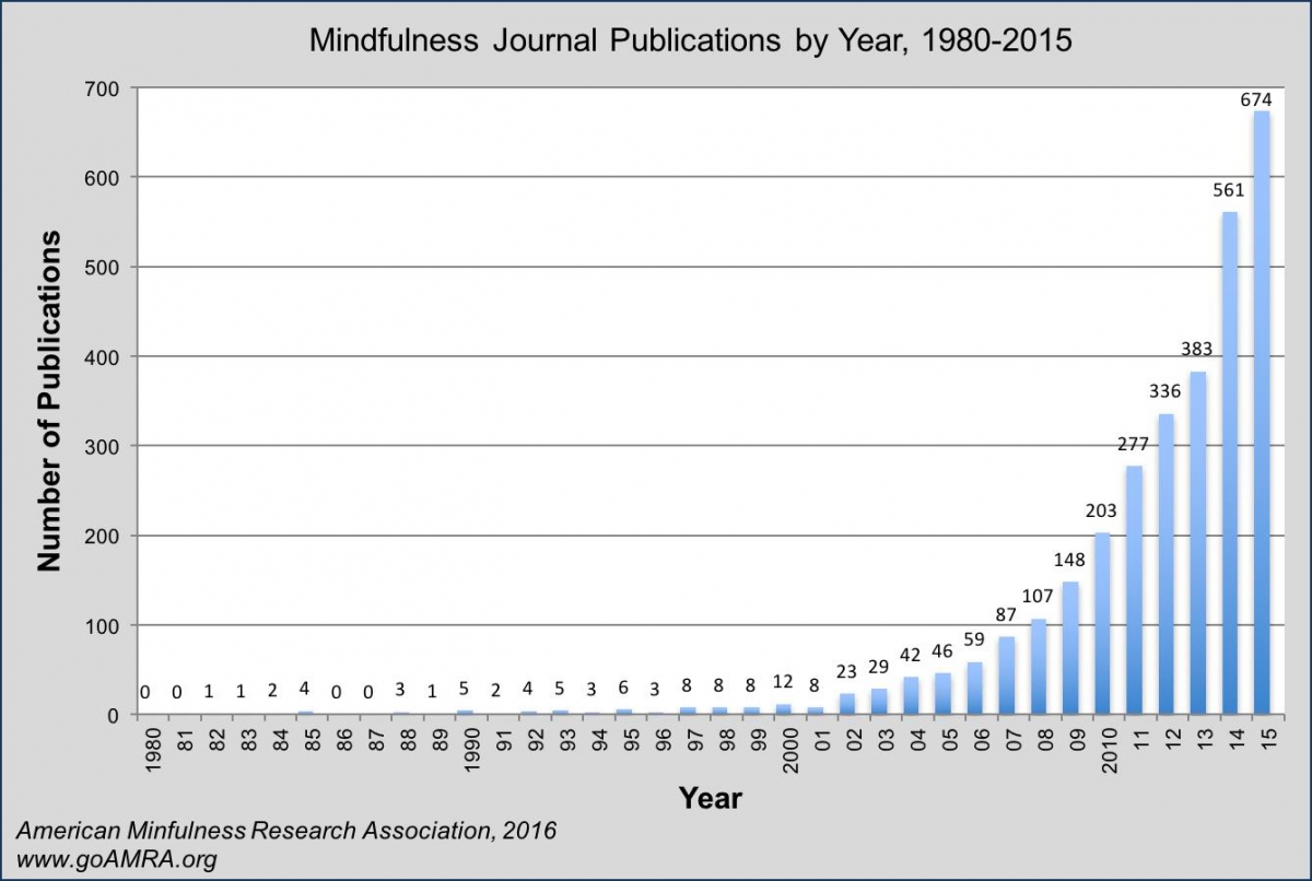 In den letzen Jahren wurde Achtsamkeit außerdem zu einem beliebten Forschungsthema: Zählte die American Mindfulness Research Association im Jahr 2000 in einer bedeutsamen Quelle für wissenschaftliche Veröffentlichungen, dem Web of Science, nur zwölf Publikationen zum Thema Achtsamkeit in wissenschaftlichen Zeitschriften, so waren es im Jahr 2015 bereits 674 (s. Abbildung 1).