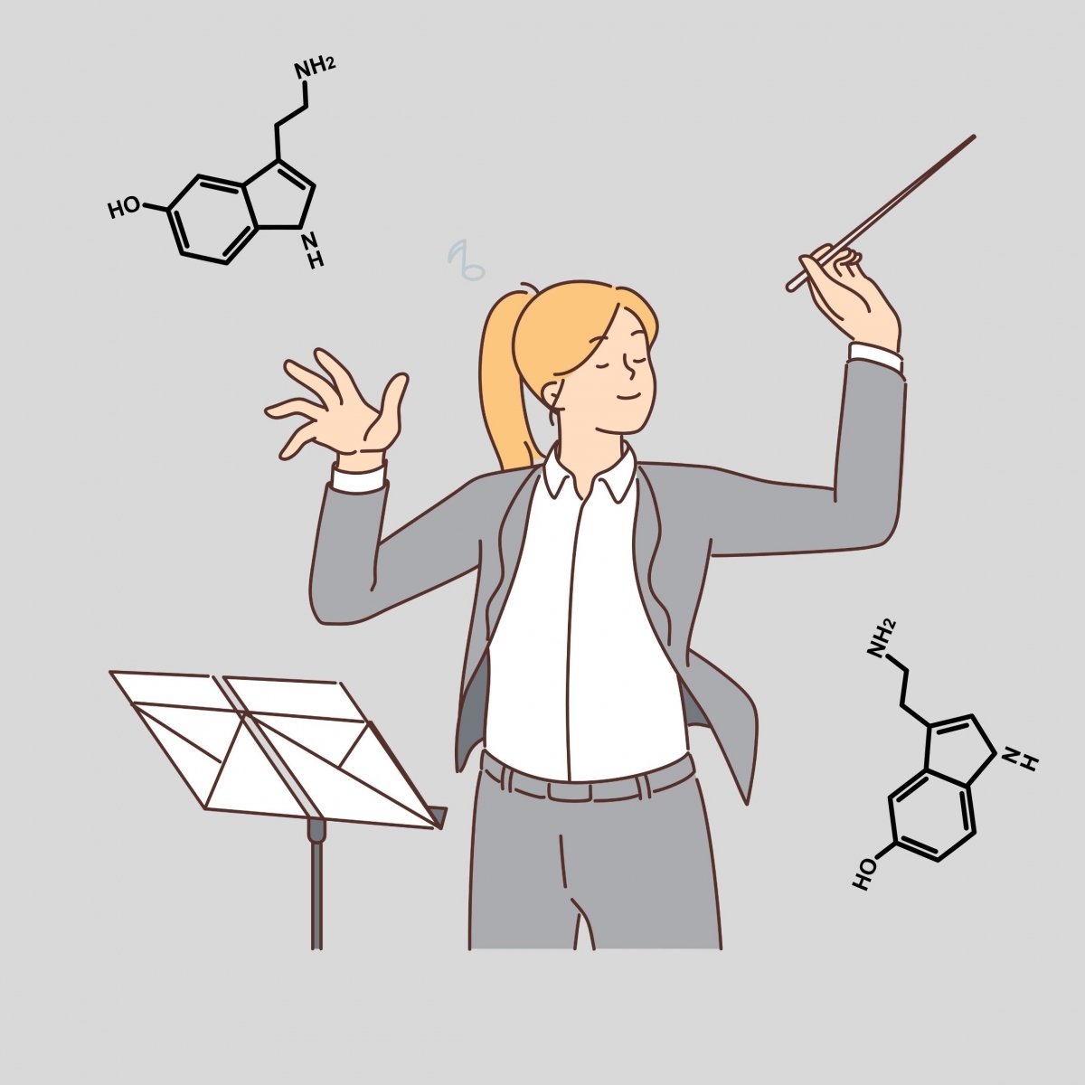 Dopamin hingegen ist der Star-Solist, der mit dem Orchester spielt. Er steht im Rampenlicht, zieht Aufmerksamkeit auf sich und sorgt für spektakuläre Höhepunkte. Dopamin bringt Motivation und Belohnung – genau wie ein virtuoses Solo, das das Publikum begeistert und den Solisten zu Höchstleistungen antreibt. Wenn der Solist sein großes Solo spielt, reißt es das Publikum mit – genauso wie eine Dopaminausschüttung uns beim Genuss eines Schokoladenstücks oder dem Erreichen eines Ziels euphorisch fühlen lässt.